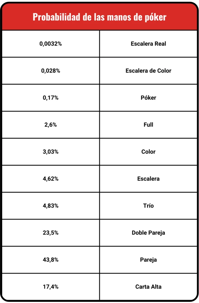 - Carta Alta: La carta de mayor valor cuando no se tiene ninguna de las combinaciones anteriores.