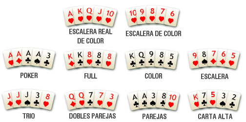- Escalera Real: Diez, Jota, Reina, Rey y As del mismo palo.